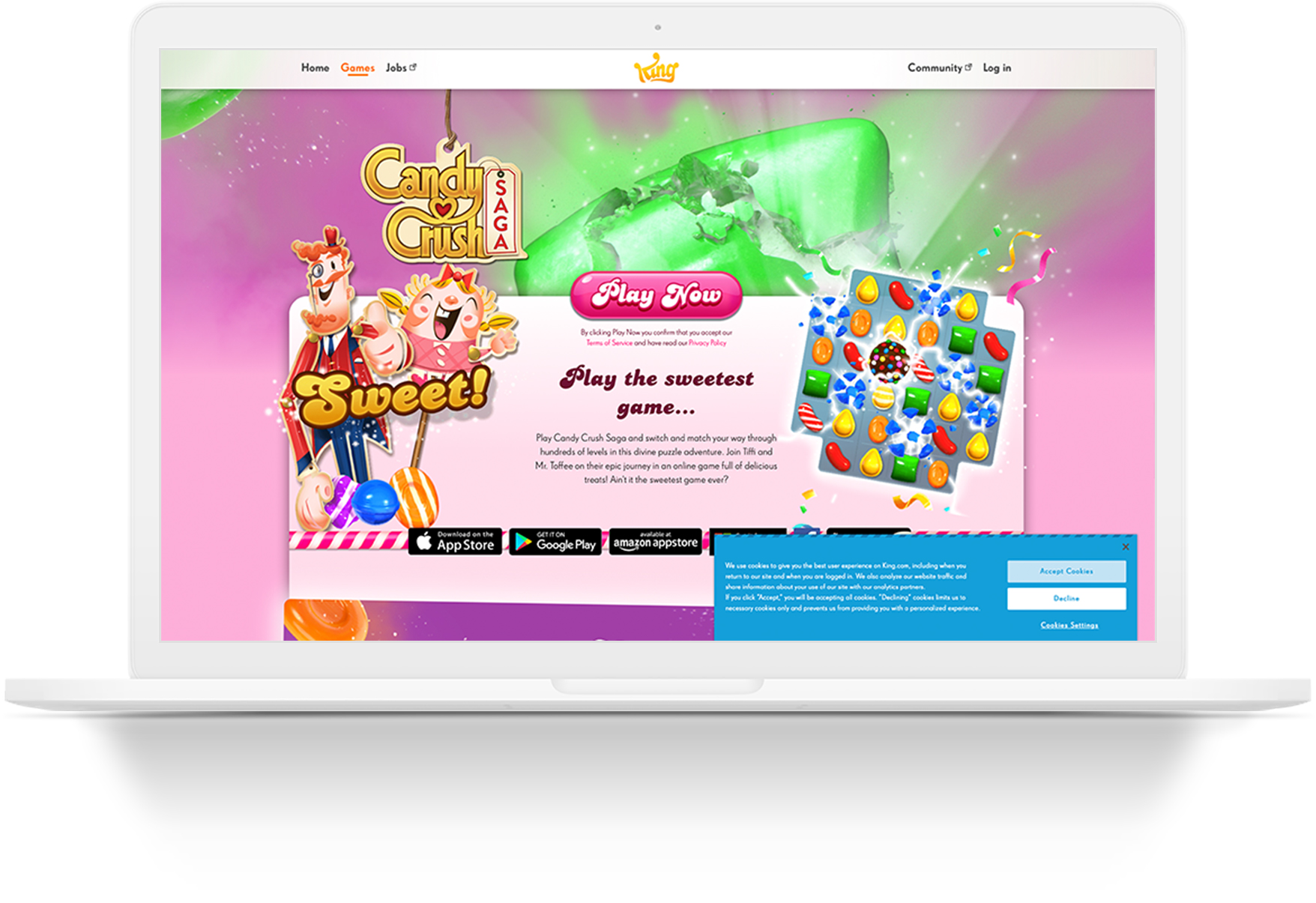 Candy Crush Saga is a free-to-play tile-matching video game released by King on April 12, 2012, originally for Facebook; other versions for iOS, Android, Windows Phone, and Windows 10 followed. It is a variation of their browser game Candy Crush. The brand uses Shopify to sell to it's customers online.